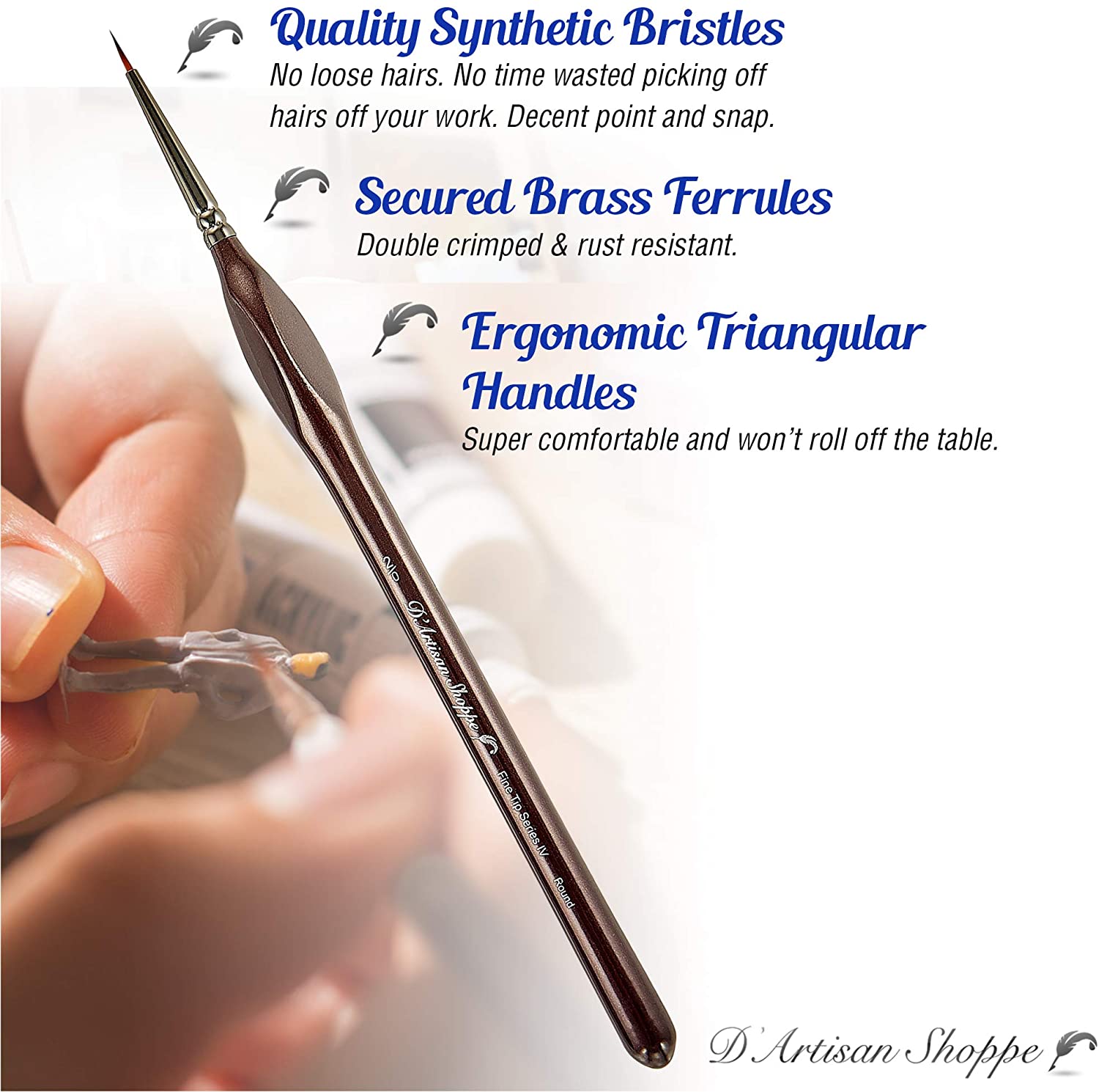 - Easy Grip Handle: Special triangular wood handle designed for a comfortable grip makes this fine tip paint brush easier to control for painting long hours thus reducing hand fatigue. The triangle grip also prevents your artist paint brushes from rolling off the table.