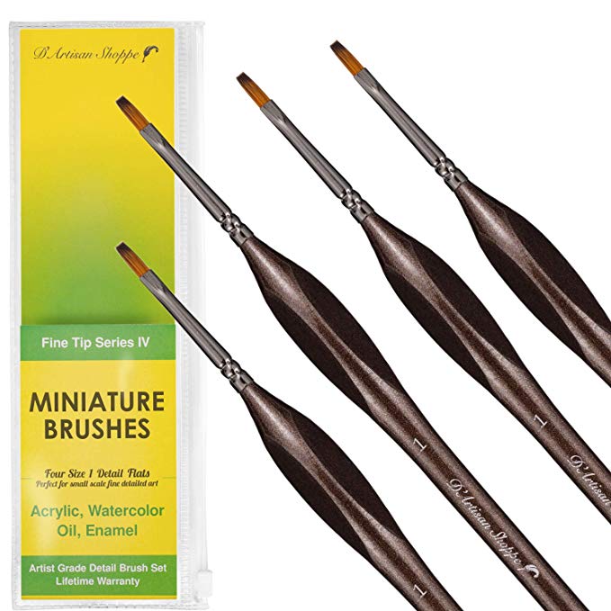 Need extra brushes on hand instead of constantly cleaning and reloading your small detail brush?This set of four Flat #1 acrylic brushes is the solution. Save your expensive sable brushes by using these for mixing, base coating, and dry brushing.